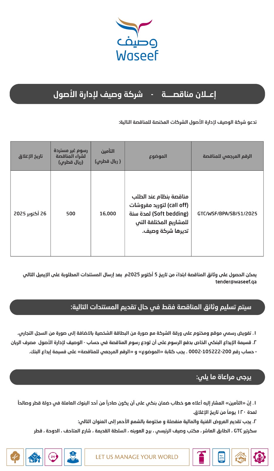 For tenders, please send your requests to tender@waseef.qa e-mail as we will not accept any tenders in person starting from today until further notice
