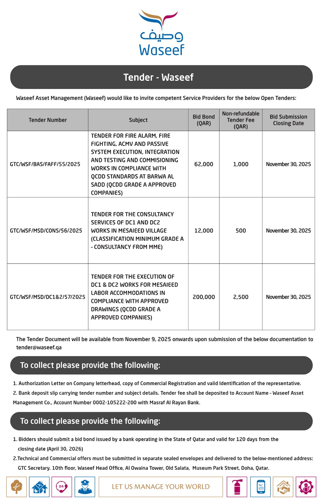For any tender collection, please contact tender@waseef.qa since we will not accept any personal collection from today until further notice.