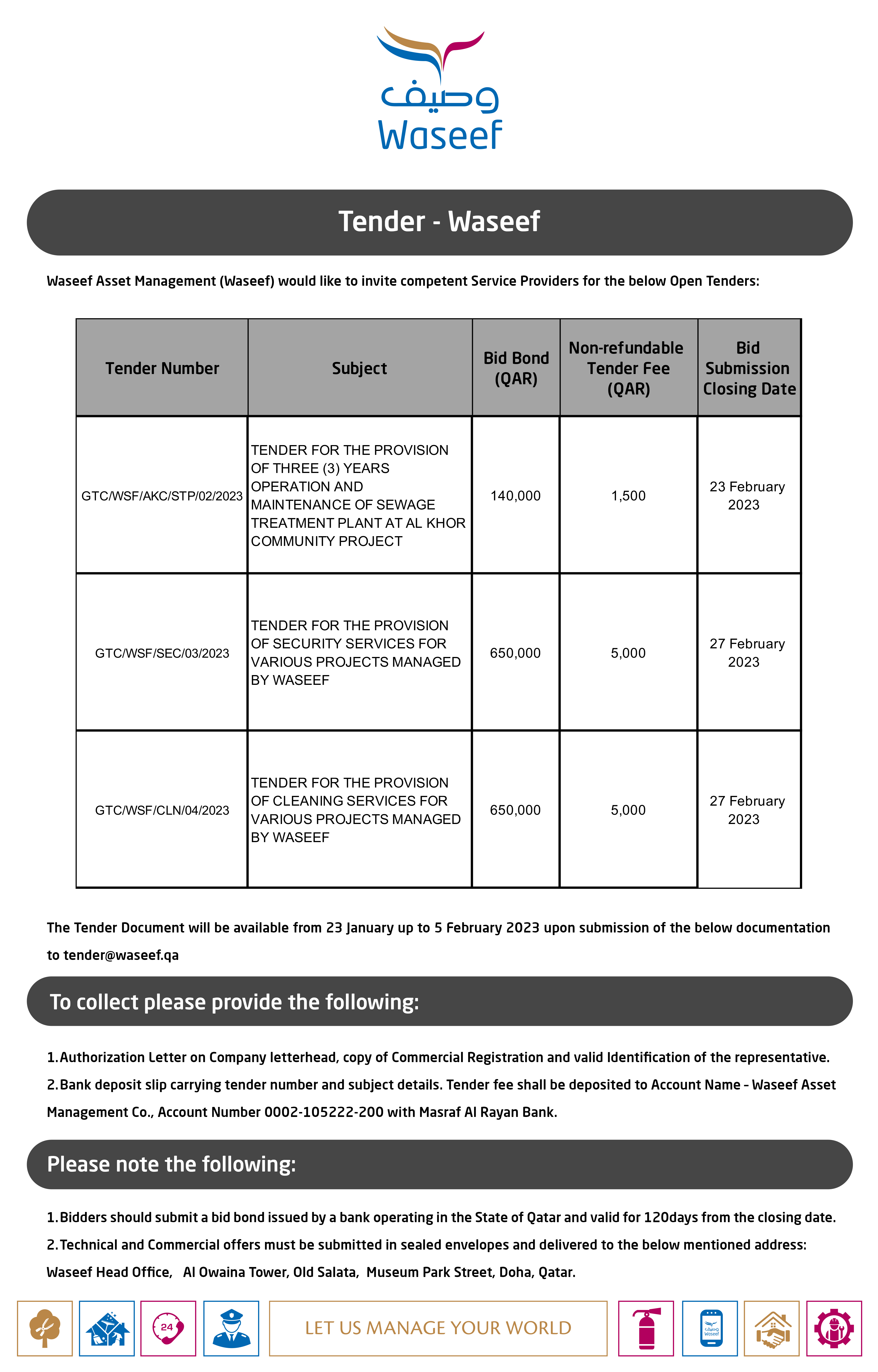 For any tender collection, please contact tender@waseef.qa since we will not accept any personal collection from today until further notice.